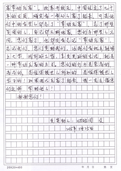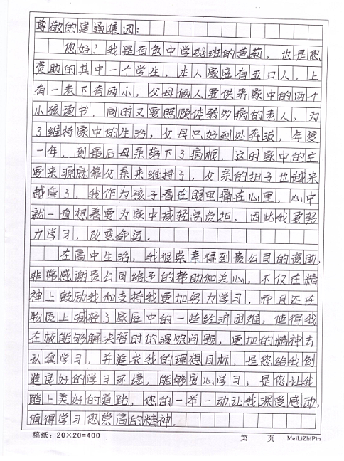 今年3月,百色中學(xué)的30多位受助學(xué)生紛紛給集團(tuán)寫來了感謝信,感謝集團(tuán)對他們的資助,讓他們能繼續(xù)安安心心的讀書,不用為因家里困難而隨時(shí)面臨輟學(xué)的事情困擾。