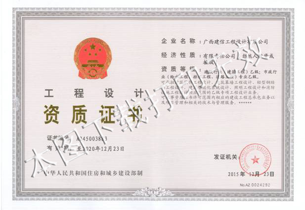 繼我集團(tuán)廣西建信工程設(shè)計(jì)有限公司2015年12月11日成功獲得工程設(shè)計(jì)市政行業(yè)(給水工程、排水工程)專業(yè)乙級(jí)資質(zhì)增項(xiàng)后,根據(jù)廣西建設(shè)網(wǎng)2015年12月31日發(fā)布公告,我公司順利通過資質(zhì)審查,成功將市政行業(yè)(道路工程)專業(yè)晉升為乙級(jí)資質(zhì)!