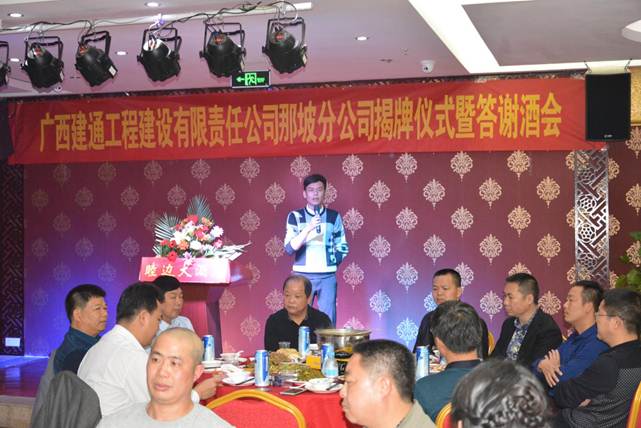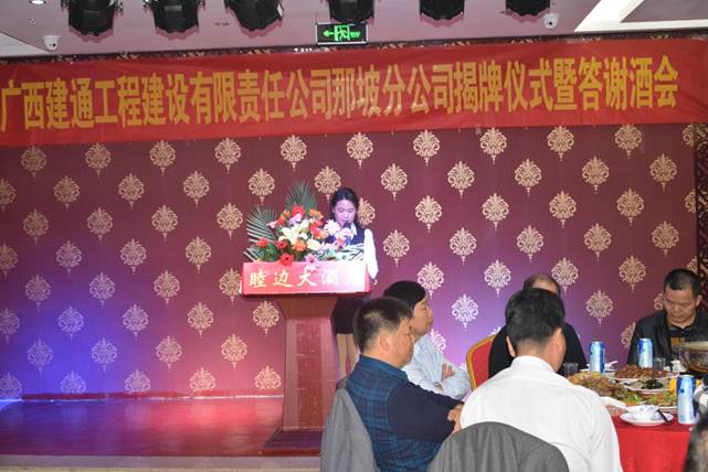 在慶典晚宴上,首先由廣西建通工程建設(shè)有限責(zé)任公司那坡分公司總經(jīng)理王曉玲發(fā)表致辭,她說(shuō):“德建志遠(yuǎn),業(yè)通人和”是我們集團(tuán)最新提出的發(fā)展口號(hào),廣西建通投資集團(tuán)是一個(gè)朝氣蓬勃,充滿活力,富有想象力和創(chuàng)造力的企業(yè),集團(tuán)培養(yǎng)了我們誠(chéng)信的為人之道,求實(shí)的工作作風(fēng)。分公司將致力加強(qiáng)對(duì)員工道德品質(zhì)的培養(yǎng),加強(qiáng)對(duì)員工專業(yè)能力、服務(wù)質(zhì)量的把控,發(fā)揚(yáng)團(tuán)隊(duì)精神,為集團(tuán)品牌建設(shè)及戰(zhàn)略發(fā)展目標(biāo)添磚加瓦。一如既往秉承“以質(zhì)量求信譽(yù),以信譽(yù)求發(fā)展”的理念,為投資者和項(xiàng)目業(yè)主提供專業(yè)化、高水準(zhǔn)、全方位的服務(wù),以專業(yè)化的管理做強(qiáng)分公司、做大建通品牌為已任,抓住機(jī)遇!共同努力在建通平臺(tái)上實(shí)現(xiàn)更高的人生價(jià)值,我公司熱忱地期望能與社會(huì)各界新老朋友精誠(chéng)合作、攜手共進(jìn),創(chuàng)造更加輝煌的未來(lái)。