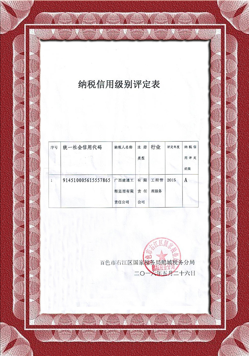 廣西建通投資集團旗下子公司廣西建通工程監(jiān)理有限責(zé)任公司憑借誠信納稅的良好信譽,榮獲百色市2015年度納稅信用A級企業(yè)!