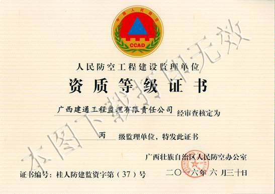 根據(jù)國(guó)家人防辦《人防工程監(jiān)理行政許可資質(zhì)管理辦法》以及《廣西壯族自治區(qū)人民防空行政審批操作規(guī)范》等有關(guān)規(guī)定,廣西建通工程監(jiān)理有限責(zé)任公司人防工程監(jiān)理丙級(jí)資質(zhì)證書(shū)在有效期屆滿后,及時(shí)向自治區(qū)人防主管部門(mén)提交資質(zhì)延續(xù)申請(qǐng)材料,并于2016年6月30日成功獲得新頒發(fā)的人防工程監(jiān)理丙級(jí)資質(zhì)證書(shū)。該資質(zhì)業(yè)務(wù)范圍為:本行政區(qū)域內(nèi)抗力等級(jí)6級(jí)、6B級(jí)及建筑面積1萬(wàn)平方米以下的人防工程監(jiān)理業(yè)務(wù), 證書(shū)有效期至2017年8月30日。