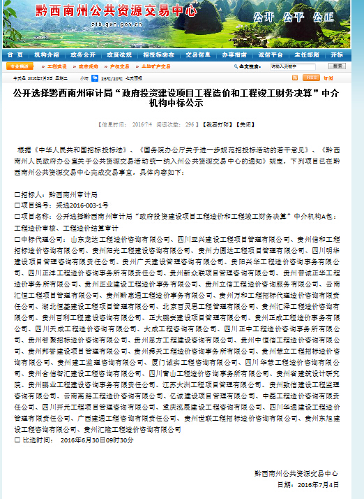 我貴州直營分公司在繼“公開選擇黔西南州水務(wù)局水利項目招標備選招標代理機構(gòu)”入庫成功后,又成功入選公開選擇黔西南州審計局“政府投資建設(shè)項目工程造價和工程竣工財務(wù)決算”中介機構(gòu)A包:工程造價審核、工程造價結(jié)算審計。本次共有93家單位參與投標,我公司在激烈的競爭中成功打敗43家單位,成為中標的50家單位之一。