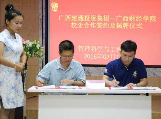 2016年7月11日,廣西建通投資集團-廣西財經(jīng)學(xué)院校企合作簽約及揭牌儀式在廣西財經(jīng)學(xué)院隆重舉行。集團鄧安杰董事長帶領(lǐng)集團高層及監(jiān)理公司、檢測公司代表,廣西財經(jīng)學(xué)院總會計師寧旭初帶領(lǐng)的招就處、管理學(xué)院領(lǐng)導(dǎo)班子成員及師生代表出席了簽約及揭牌儀式。儀式由管理科學(xué)與工程學(xué)院工程造價系主任梁華主持,寧旭初總會計師、鄧安杰董事長分別作了熱情洋溢的發(fā)言。