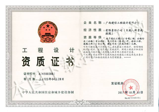 2017年05月18日,從廣西住房和城鄉(xiāng)建設(shè)廳官網(wǎng)再傳來(lái)喜訊,廣西建通投資集團(tuán)旗下子公司廣西建信工程設(shè)計(jì)有限公司順利通過了廣西住建廳資質(zhì)審查,成功增項(xiàng)公路行業(yè)(公路)專業(yè)丙級(jí)資質(zhì),有效期至2022年4月28日。該資質(zhì)可承攬三級(jí)、四級(jí)公路及其交通安全、管理、養(yǎng)護(hù)等設(shè)施設(shè)計(jì)業(yè)務(wù)。至此,廣西建通投資集團(tuán)旗下子公司廣西建信工程設(shè)計(jì)有限公司擁有了建筑行業(yè)(建筑工程)乙級(jí)、市政行業(yè)(給水工程、排水工程、道路工程)專業(yè)乙級(jí)、風(fēng)景園林工程設(shè)計(jì)專項(xiàng)乙級(jí)、城鄉(xiāng)規(guī)劃編制乙級(jí)和公路行業(yè)(公路)專業(yè)丙級(jí)等資質(zhì)。