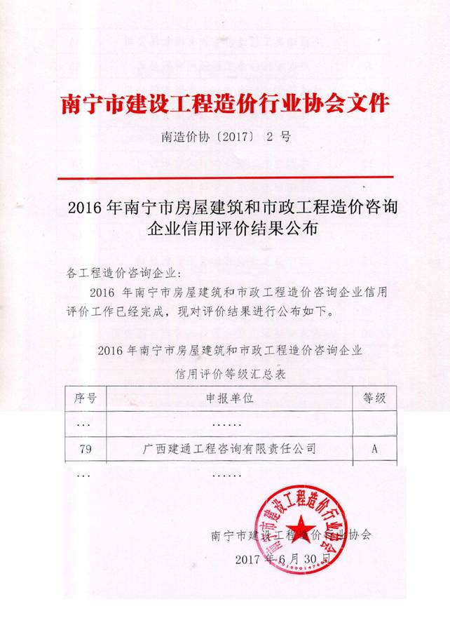 2017年6月30日從南寧市建設(shè)工程造價行業(yè)協(xié)會傳來喜訊,建通投資集團(tuán)旗下子公司廣西建通工程咨詢有限責(zé)任公司獲得由該協(xié)會頒發(fā)的2016年南寧市房屋建筑和市政工程造價咨詢企業(yè)信用評價A等級榮譽(yù)。