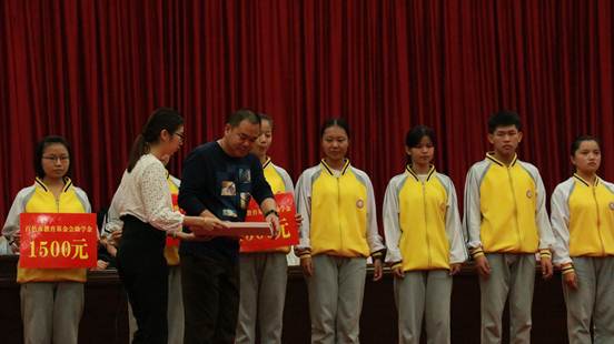 圖為集團副總裁黃承理給受助學(xué)生頒發(fā)助學(xué)金