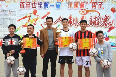 “感謝建通投資集團(tuán)捐資贊助百色中學(xué)開展足球聯(lián)賽,通過比賽,同學(xué)把團(tuán)結(jié)協(xié)作、頑強(qiáng)拼搏、勇攀高峰的競技精神轉(zhuǎn)化為強(qiáng)大的學(xué)習(xí)動(dòng)力,達(dá)到了預(yù)期目的!”這是2017年12月26日16時(shí)30分,百色中學(xué)黃振剛副校長在首屆“建通杯”校園足球聯(lián)賽閉幕致辭時(shí)說出的一番肺腑之言。建通投資集團(tuán)副董事長黃樹威應(yīng)邀出席閉幕式并為獲獎(jiǎng)班級頒獎(jiǎng)。