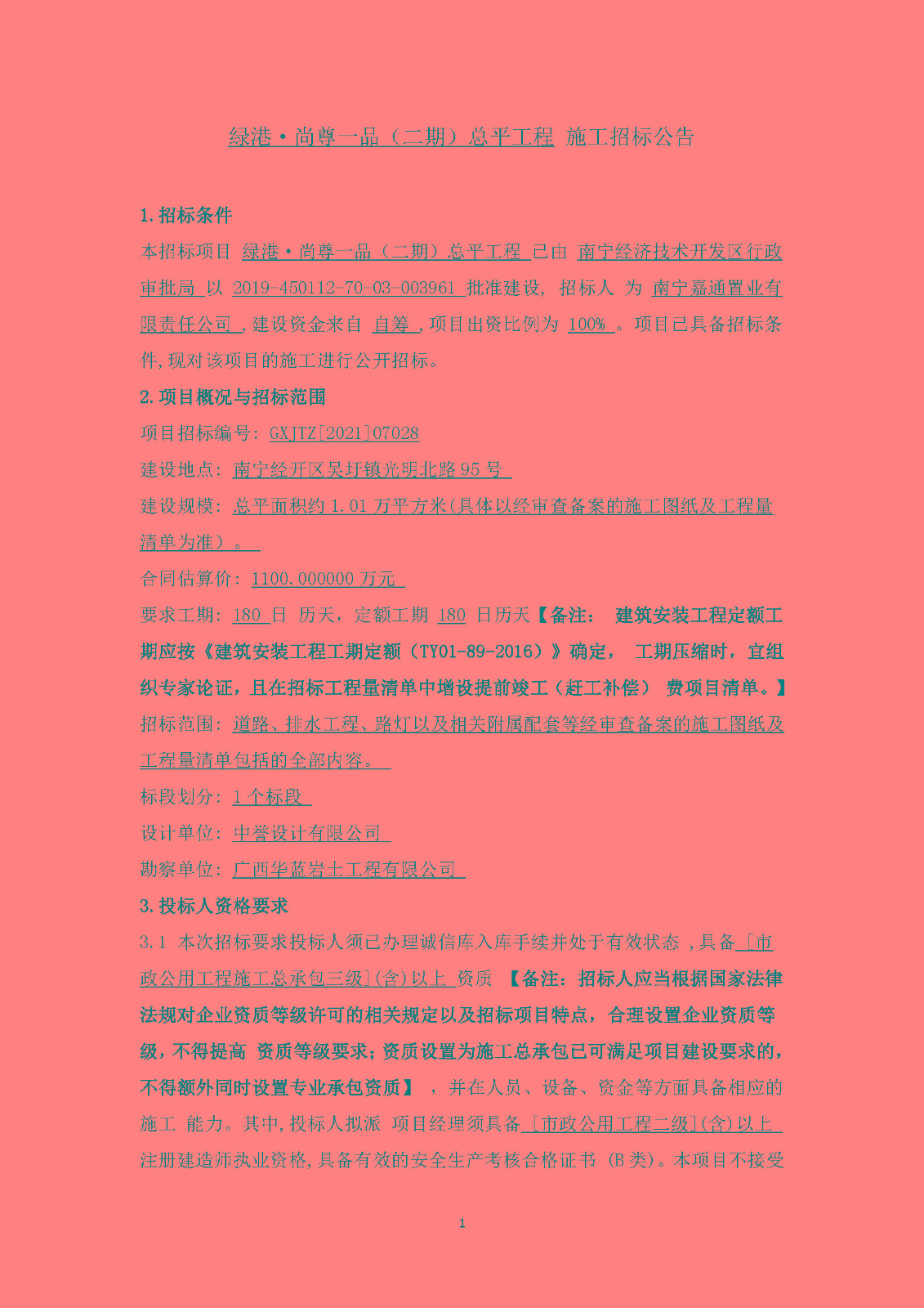 綠港·尚尊一品(二期)總平工程施工招標(biāo)公告