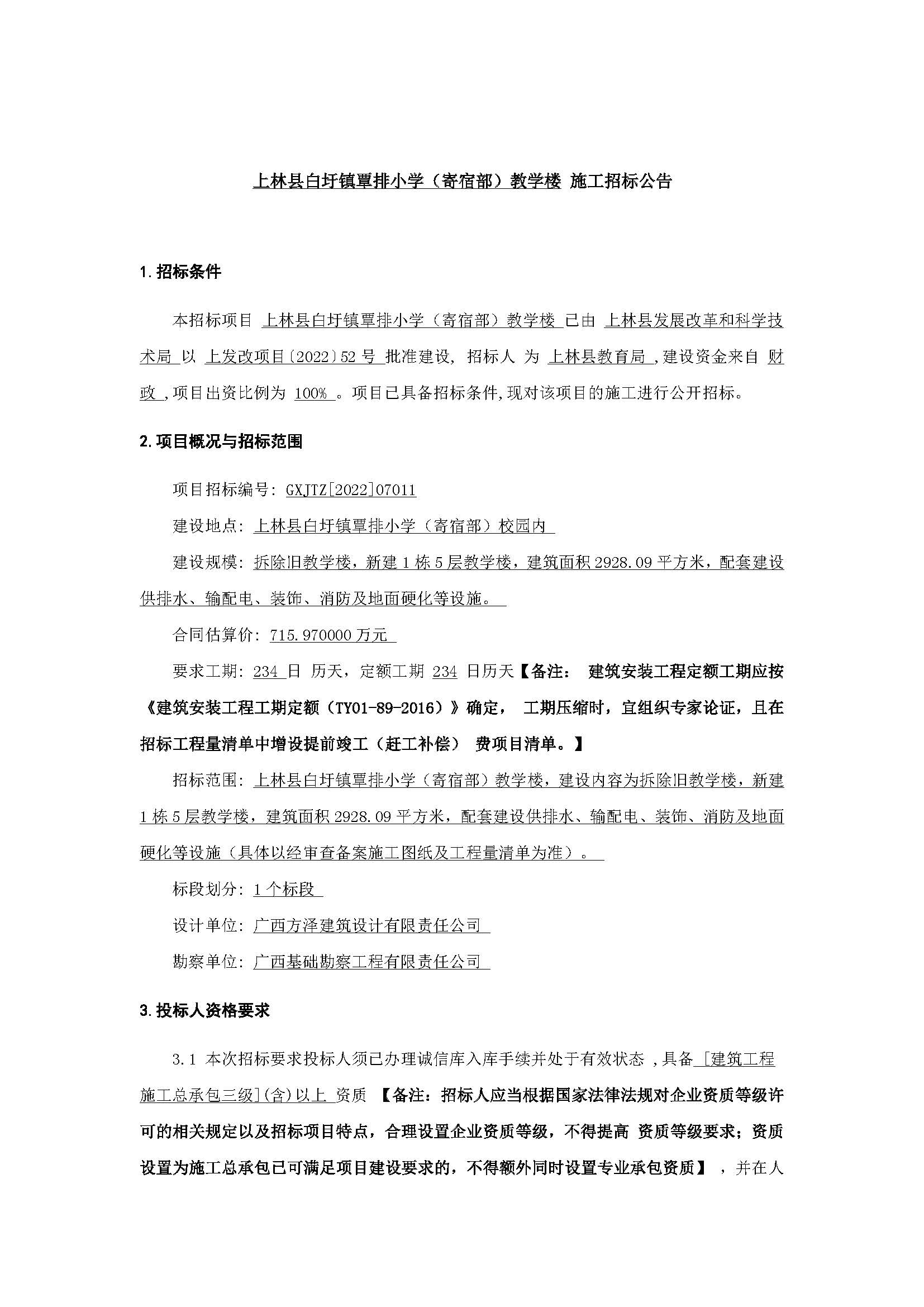 上林縣白圩鎮(zhèn)覃排小學(xué)(寄宿部)教學(xué)樓施工招標(biāo)公告